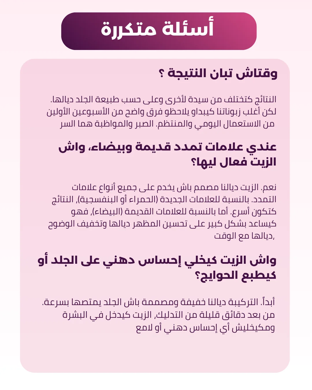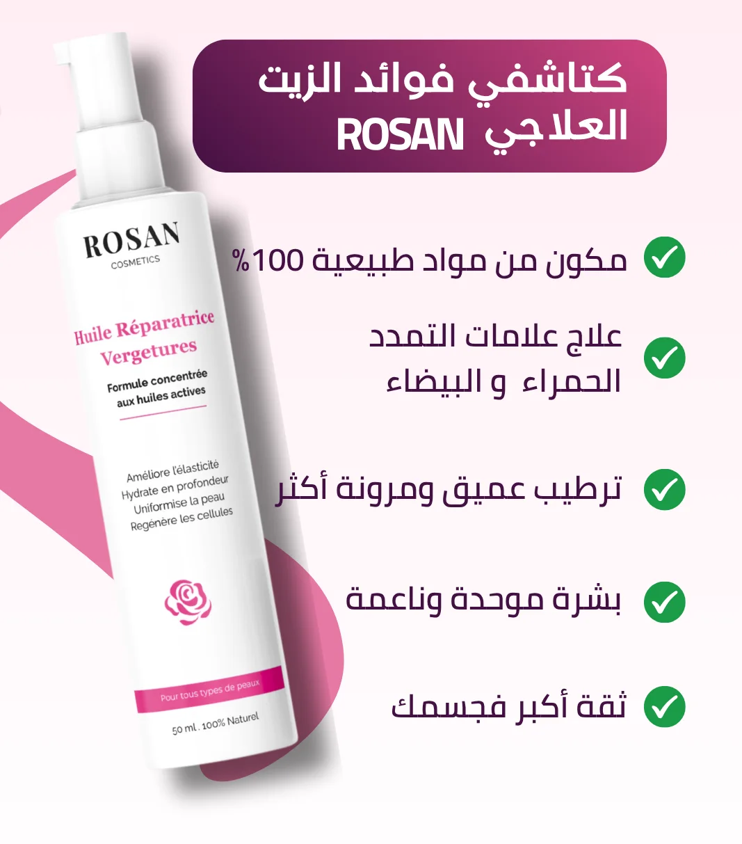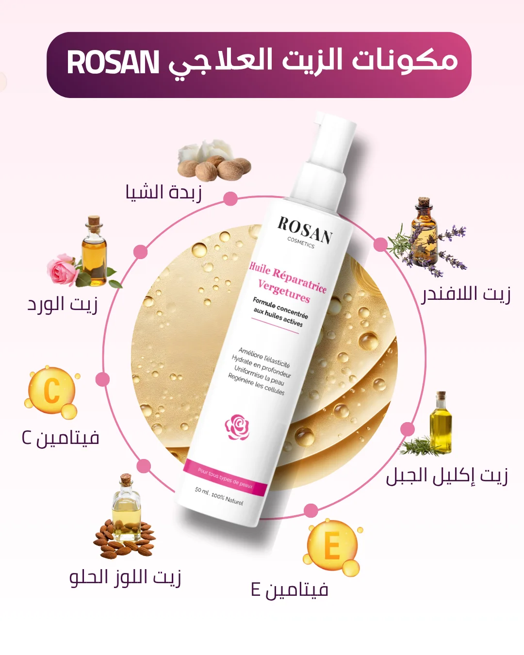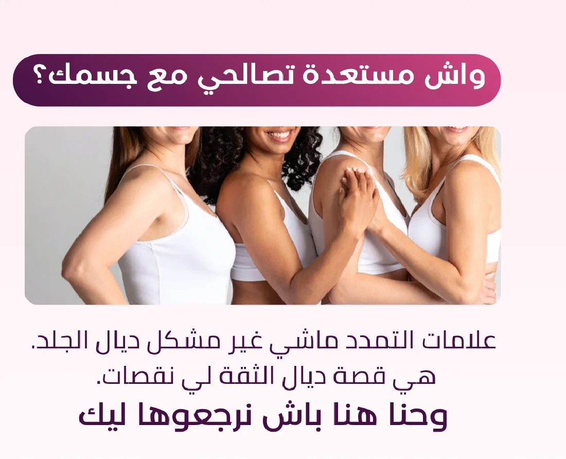 تركيبة طبيعية مصممة خصيصا باش ترجع لبشرتك الحيوية ديالها وتخفف من مظهر علامات التمدد. كل قطرة هي خطوة نحو الثقة